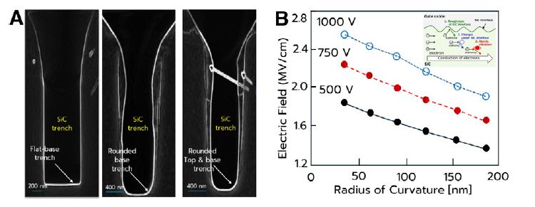 However, these advantages come with engineering challenges. The bottom of the trench, if etched with a sharp radius, can concentrate electric fields, creating premature breakdown points and compromising device lifetime, as shown in Fig. 1. Similarly, excessive sidewall roughness can serve as a leakage pathway. The trench profile—shape, corner radius, and smoothness—must be carefully optimized through etch chemistry and post-processing such as oxidation and annealing.