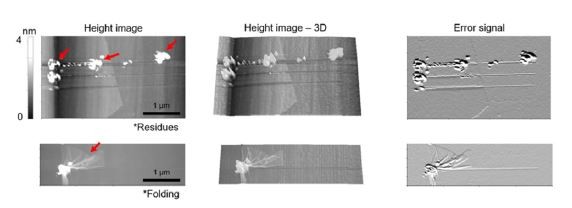 However, this method has some notable drawbacks. The AFM tip is prone to wear and damage due to the high force applied during cutting, which can reduce accuracy over time and necessitate more frequent tip replacements. As shown in Fig. 3, there is also a risk of unintended damage or deformation to the surrounding graphene due to the mechanical force, which can degrade the quality of the patterned structure. This often results in rough or jagged edges along the cut regions—especially at higher forces—potentially impacting the electronic properties of graphene where smooth edges are essential.