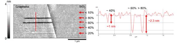 We first demonstrated graphene cutting possibilities according to the applied bias. Consequently, the applied voltage significantly affected the extent and depth of the oxidation on graphene, which influences the degree of cutting (Fig. 4).