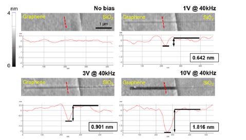 Bias Mode (Electrochemical method): In this mode, a bias voltage is applied between the AFM tip and the substrate, creating an electric field that induces a local oxidation reaction at the graphene surface. This results in oxidized graphene regions that can be selectively removed, effectively "cutting" the graphene. It is especially useful for precise and controlled modifications of graphene without requiring high physical force.
