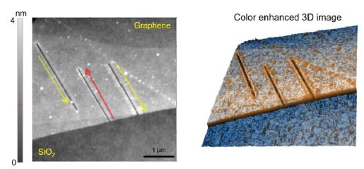 As shown in Fig. 6, when the AFM tip was allowed to contact the sample (graphene or Si substrate) very slowly, it was confirmed that the graphene was successfully cut in any direction. This is because when the AFM tip is very close to the graphene surface, a water bridge forms first, causing local oxidation and removing the graphene beneath it. SmartScan™ (Park Systems’ AFM operation software) enables precise control of these parameters, resulting in more consistent and effective graphene cutting.