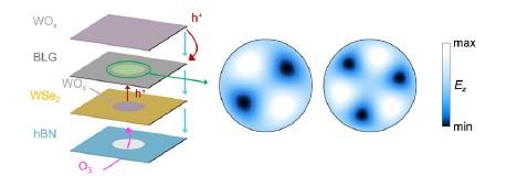 This charge-transfer approach enables a powerful fabrication strategy: mask-defined plasmonic cavities in continuous graphene. By placing a pre-patterned hBN mask with nanoscale apertures over graphene before oxidation, Prof. Kim’s team can locally expose regions to WOx formation. The result is a pattern of high-density, plasmon-active regions embedded in a continuous sheet of pristine graphene.