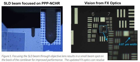 Figure 5. Focusing the SLD beam through objective lens results in a small beam spot on the back of the cantilever for improved performance. The updated FX optics can resolve 0.87 µm linewidth.