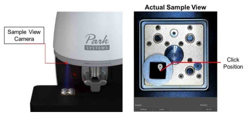The FX40 system comes with a Multi Snap-in Sample Chuck standard. Users can populate four sample plates that are kinematically mounted. The positioning repeatability of the sample disks is 5 µm in both X and Y. Using the four sample plates with repeatable positioning, one can make easy comparison between reference and target samples, e.g., KPFM work function, SCM dopant concentration, PinPointTM nanomechanical, or SThM thermal measurements. The FX40 system uses a lowmagnification sample view camera to aid the operator navigating to the desired imaging location. As the user clicks on the optical view screen, the XY stage coordinate of the clicked position is recognized, and the XY stage moves to locate the desired measurement directly underneath the probe tip.