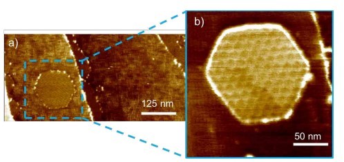 Figure 14. Moiré pattern observed on graphene on h-BN. a) Topography scan of graphene on h-BN, vertical scale 0 to 6 nm. b) Zoom in: Moiré pattern clearly visible, vertical scale 0 to 6 nm.