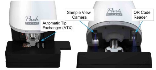 Park FX40 has the most advanced AFM design and interfaces for user convenience. High-level automation is the central design consideration that includes automatic probe exchange and SLD beam alignment with a click of button using pattern recognition. Inside FX40, there are three camera modules: 1) a main view camera at the system center, 2) a sample view camera on the left side of the system, and 3) a QR code reader on the right side. On the right side of the XY stage, there is the automatic tip exchanger (ATX) module that can hold up to 8 AFM probes. A sliding protective cover prevents foreign objects from dropping into the ATX module when it is not in use.
