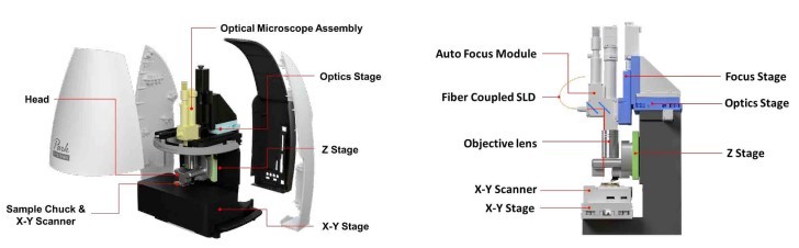 Figure 3. Front view of Park FX40. The view on the right reveals some major components normally hidden by the microscope housing. Figure 4. The Optical Microscope Assembly is decoupled from the moving plate of Z stage, reducing total Z-stage mass. Fiber coupled SLD is attached to the Optical Microscope Assembly. SLD beam is focused through objective lens and always fixed at the center of optical vision.
