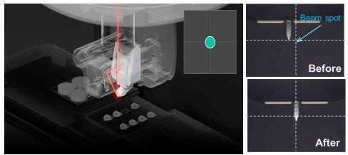 The SLD beam emerging from the objective lens is focused onto the cantilever and reflected by a steering mirror. To complete the beam-bounce alignment, two motors inside the FX AFM head adjust the angle of the SLD beam to the cantilever. Based on the machine learning of a probe pattern, position of a probe is found by vision recognition.
